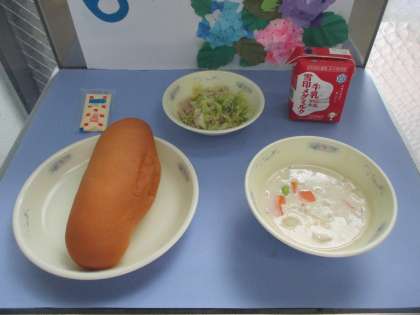 ハムサンドの具に自分でマヨネーズをかけてパンにはさんで食べる献立です。自分でマヨネーズをかけて,好きな味つけをしてね!と伝えると,目をキラキラと輝かせていました。パンにはさんで大きな口をあけて嬉しそうに食べていました。今日はどの学年も食缶はからっぽ!ペロリと完食でした。
