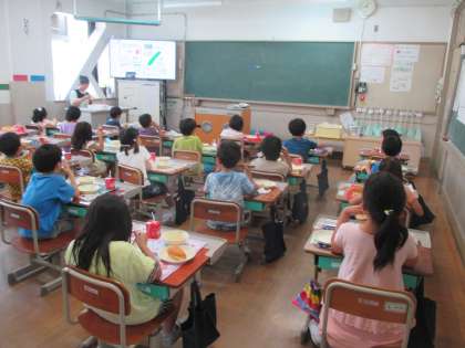 今日の給食は,夏野菜のボロネーゼ(チーズ入り),野菜の洋風煮,味付けコッペパン,牛乳でした。夏野菜のボロネーゼは夏においしい野菜がたくさん使われていて,夏にぴったりのメニューです。今日は1年生と一緒に給食を食べました。食欲旺盛な1年生。見ていて大きな成長を感じました。