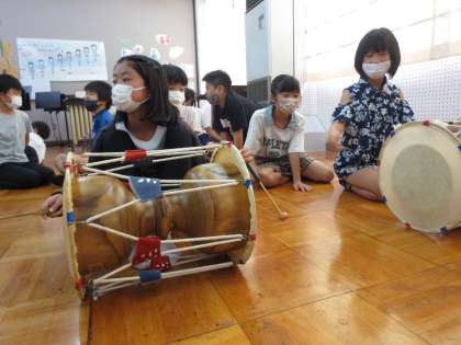 左右でバチの形も握り方も違う独特な演奏法に子ども達は終始,楽しみながら活動することができていました。
