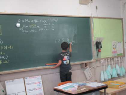 今日は,長さや重さの単位を小数を使うことで変換できるということを学習しました。1km,1kg=1000m,1000gをもとに0.1kmや0,01kgの単位を変えるとどう表すことができるのかをみんなで考えました。0の個数と小数点の動かし方を関連付けて考えている意見もありました。