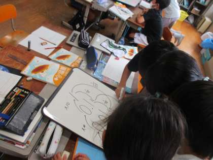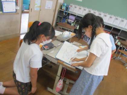 今日はグループに分かれて,小数のしくみや1,0.1,0.01,0.001の関係性について考えました。10倍や10分の1などの言葉を使ってホワイトボードに考えをまとめました。