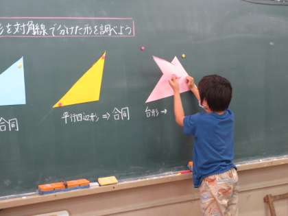 平行四辺形や台形などの四角形を対角線で切った時にできる三角形について調べました。