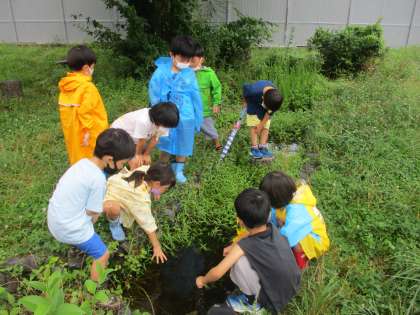 生活科で雨が降りそうだったので,レインコートをきていざ運動場に向かいました。しかし,パラパラと降っただけでした。それでも,草むらの虫を見つけたり,水たまりに入ったりして,探検を楽しんでいました。いろいろな発見があったようです。