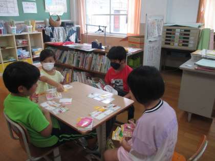休み時間にカードゲームをしました。「レシピ」という具材カードを集めて、料理をつくるゲームです。ひとりひとり仕上げる料理が違うので、周りが何の料理をつくって何の具材カードを求めているか伺いながら、頭を使って楽しんでいました。