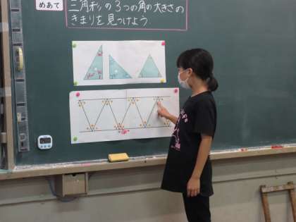 そこから,三角形の角を全て合わせると180度になることにも気がつきました。
