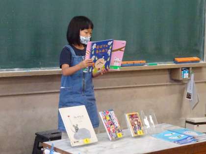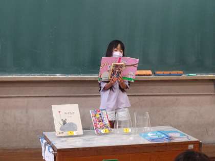 グループでのしょうかいで 人気のあった本を、ぜんいんの前でしょうかいしてもらいました。