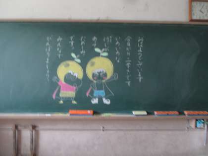 学期はじめには、担任の先生が黒板に子どもたちへのメッセージを書きます。その際に絵が描いてあることが多く、そのレベルの高さにいつも驚かされます。子どもたちも大喜びで眺めています。みなさんにもその素晴らしさを感じていただければと思います。