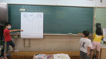 算数科では、「長さ」の学習に入りました。長いものや、曲がっているものの長さをはかるときには巻尺を使うとよいことを知り、教室のいろいろなところの長さを予想し、実際にはかる活動を行いました。「1mのものさしだといくつ分かな。」「僕の身長より長いから…」などと、もとにするものを決めて予想を立てている子もいました。