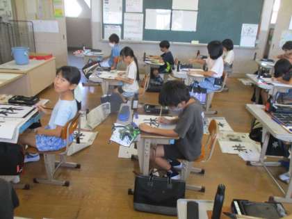 今日は朝から書写で毛筆の学習に取り組みました。今日の課題は、「林」という漢字1文字でしたが、簡単なように見えて子どもたちはとても苦戦していました。単に木という字が2つ横並びになっているわけではありません。左の木と右の木で形は全然異なります。たった8画の字ですが1画ずつていねいに書きました。