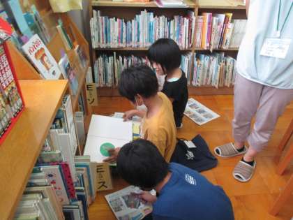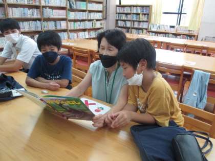 今日の読み聞かせは、「カブトムシ」。自分の経験と合わせて聞くことができました。その後は本探しゲーム。ラベルをみてお題の本を探し出しました。図書室の読みものの本は作者の名前順に並んでいることが分かりましたね。
