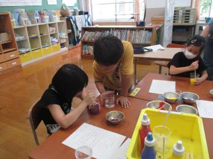 今回の「レシピをみて作ろう」はスライム作り。協力してレシピ通りにつくり、トロトロのスライムが出来上がりました。また、色作りにも挑戦し色混ぜも楽しみました。たくさんの参観ありがとうございました。一緒にできて子どもたちも嬉しそうでした。