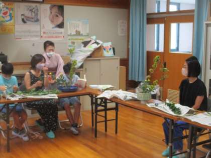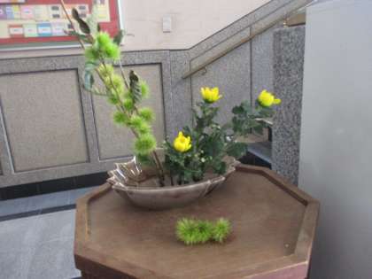 9月の生け花教室は,秋にふさわしい栗と菊を使った生け花でした。主役の栗をどのようにして目立たせるのか,楽しみながら活動することができました。