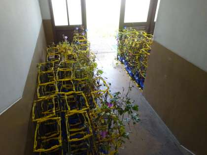 朝、トマトのうえきばちを 校しゃの中に入れました。