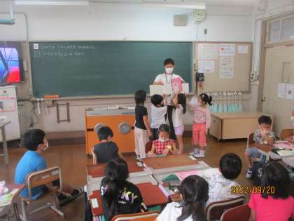 算数の時間では,「もののながさ」を学習しています。「ひもの長さは,どっちが長い」「ノートのたてとよこはどっちが長い」など班で話し合いながら学習を進めています。それぞれの班が工夫して長さを調べる方法を考えていました。他の班の考え方に感心する場面もありました。