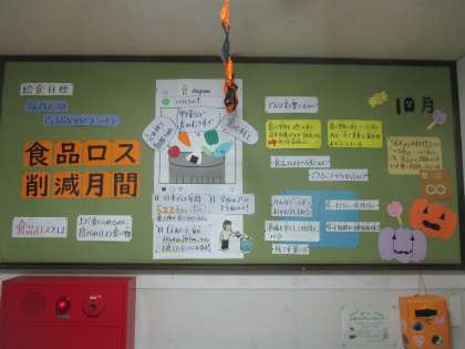 給食室前の掲示板は、今月は食品ロスについて掲示されています。これは、他人ごとではなく、自分ごととして考えていくべきことで、子どもたちにもしっかり考えてほしいと思っています。世界には、食事がとれずに死んでいく子どもがたくさんいます。日本では、毎日一人当たりお茶碗一杯分のごはんが捨てられている計算です。残さず食べる、無駄なものは買わない、など自分にできることを考えて取り組んでほしいと思います。