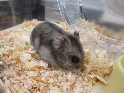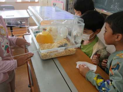 1年1組に新しい仲間が増えました。ハムスターの「モモちゃん」です。生活科の学習で,ハムスターを飼育することになりました。みんなで,えさやりやそうじのきまりを話し合って決めました。休み時間など,モモちゃんと名前を呼びながら,みんな観察をしています。人気者のモモちゃんです。