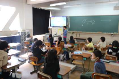 学級の友だちが行っていた国について教えてもらいました。向こうの国でのスケジュールや,食についてなど,興味のある話ばかりでした。そして友だちがその国で楽しんでいたという事実が子どもたちにさらに強く響き,みんなくぎづけでした。前で堂々と話しながら,挨拶の仕方を互いに発音している様子は,まるで授業風景のようでした。