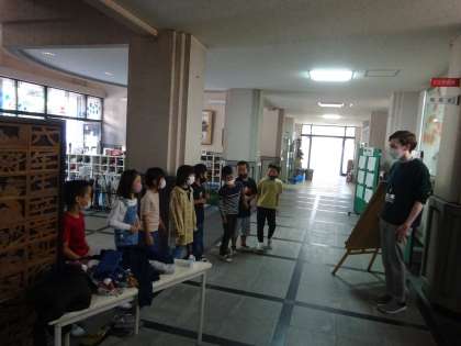 ガレス先生に、学しゅうはっぴょう会で歌う「子犬のビンゴ」と「ロンドンばし」のえい語のぶぶんを聞いてもらいました。