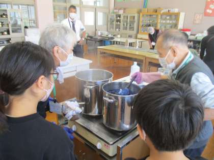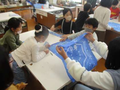 準備ができた後は、職人さんに自分の選んだ色に染めていただきました。脱水・乾燥した後は、お互いの出来上がったハンカチを広げて、見せ合いそれぞれのよさを伝えあっていました。
