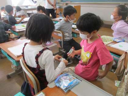 算数では,くりあがりのある足し算の学習をしています。計算カードを使って,まずは一人で学習です。どれだけの時間で計算しきれるのか,みんな競い合って計算していました。次に大きさ比べです。ペアで計算カードを一斉に出して,大きい方が勝ちになります。大きさを比べるには,計算しないといけないので,みんな必死に計算をしていました。大盛り上がりで,計算の学習ができました。