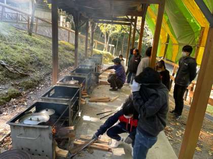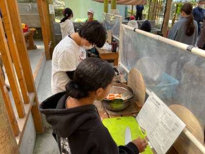 カレー作りを頑張ってます。手際よく、グループで協力して頑張ってます。さぁ、美味しいカレーはできるでしょうか