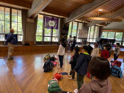 退所式をしました。たくさん褒めていただきました。まだ帰りたくないと子どもたち。よほど楽しかったのでしょう。よく頑張った5年生です。これから学校に向かいます。