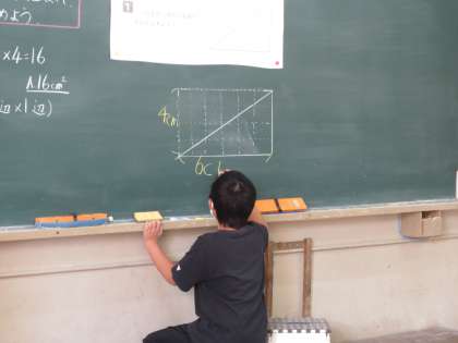長方形や正方形の面積の求め方を元にして三角形の面積の求め方を考えました。