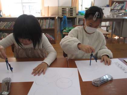 コンパスを使って円を描く練習をしました。はじめは力の入れ方が分からず、はりがずれてしまったり、線が途切れてしまったりしていましたが、何度も練習するうちに上手にきれいな円が描けるようになりました。