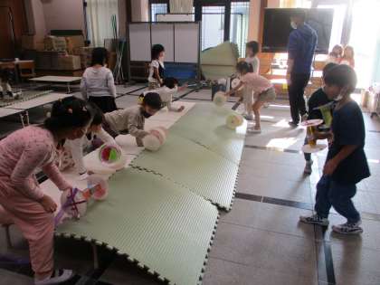 図工の学習で,紙皿などの材料からコロコロ転がる作品ができました。それぞれ工夫をこらしたデザインで,とても素敵な作品ができました。できた作品を実際に,みんなで転がしました。「とっても遠くまで転がったよ」,「転がった時,色が変わってとてもきれい」など楽しい声がたくさん聞けました。