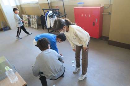 最近、中学年では折り紙遊びが流行っています。今日は休み時間に、折り紙で「めんこ」を作って遊びました。いろいろな投げ方を試しながら、遊びを楽しんでいました。
