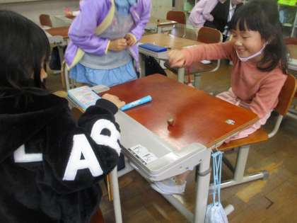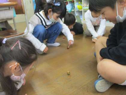 生活の時間では,秋見つけの学習で見つけたどんぐりを使って「どんぐりゴマ」を作りました。よく回るようにするために,回す部分の長さを変えたり,回したときにきれいな色になるようにデザインを考えたりしていました。これからも,秋を見つけて,いろいろな遊びをしていきます。