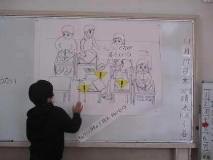 図工の学習で彫刻刀を使います。今日は、彫刻刀を使うときにどんな危険があるか、どんな対策をすればいいかをみんなで考えました。けがや事故にならないために、自分ができることをしっかり考えることができました。