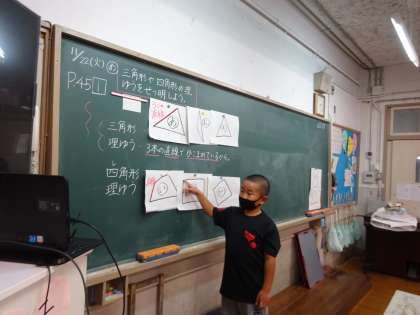 三角形と四角形に分けた後、どうしてそのグループに分けたのか、理ゆうをせつ明しました。