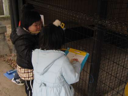 田中神社の中で飼育されているくじゃくをモデルにして自由帳に描きました。くじゃくが羽をひろげると、みんなおりの近くに集まり羽の一枚一枚を丁寧に描きました。