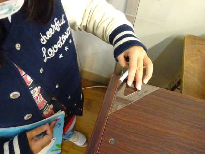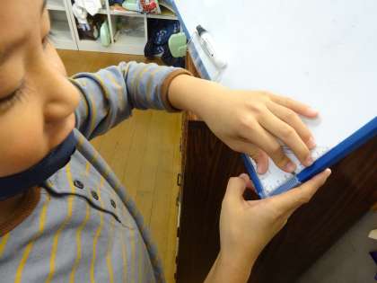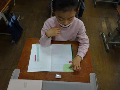 じゅぎょうの後半には、教室の中から直角のものをさがしました。