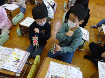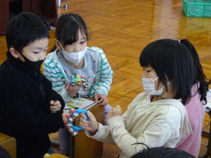 音楽室では、これまでのタンバリン・カスタネットに加えて、新しく すずとトライアングルを使いました。