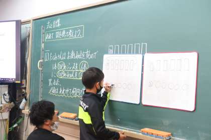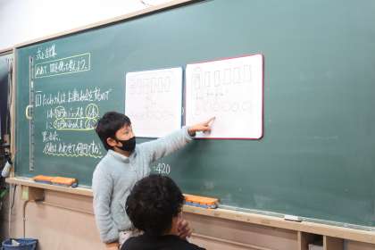 算数では、図を使って考える学習をしています。問題を読んで、どうすれば答えを求めることができるか、図を使って考えました。いくつかの方法が出てきましたが、どちらの方法でも答えは同じであること、自分の考えやすい方法を選んで計算すればよいことを確認しました。