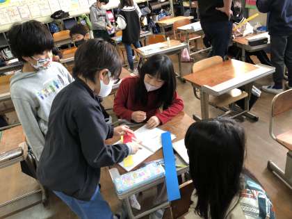 算数科では、分数の学習に入りました。今日は導入として、テープの長さを比べる活動をしました。子どもたちは、テープを折ったり、並べたりしながら、大きいテープをいくつに分けた一つ分が短いテープの長さと同じにいなるか、繰り返し試していました。
