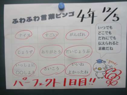 今週から12月の児童会目標に合わせたふわふわ言葉ビンゴが始まりました。子どもたちはいつも以上に意識してふわふわ言葉で温かく友だちと話していました。「○○さんナイス!」「◇◇さんありがとう」「△△さんいっしょに〜〜しよう」など素敵な言葉がたくさん聞こえていました。1日目の今日はパーフェクトビンゴだったので、明日からも継続していけるように頑張っていきたいと思います。