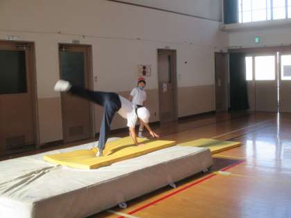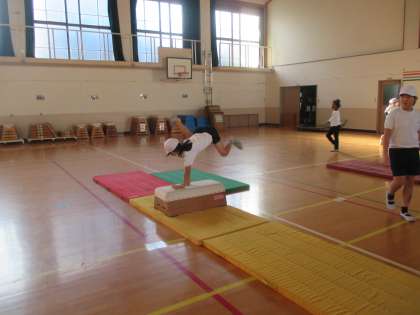 マット運動では,できる技を少しでも増やしていくために,それぞれで場を選んで練習をしています。倒立前転や側転など難しい技もできるようになってきました!