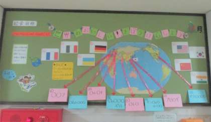 養正小学校の給食室前の掲示板では、そんな世界の料理をクイズにしました。クイズのヒントは、地図と給食です。