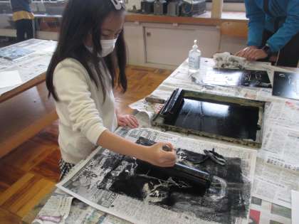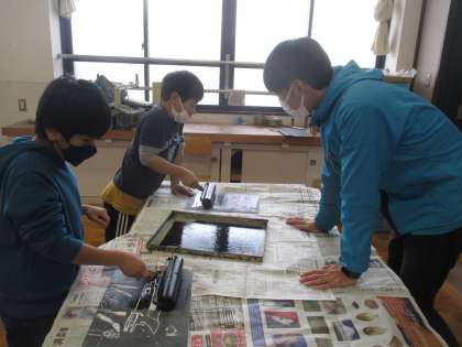 インクをつけて、版を刷りました。何回か繰り返すことによって、きれいにうつるように、さっきうまく刷れなかったところの修正をする姿が見られすてきでした!