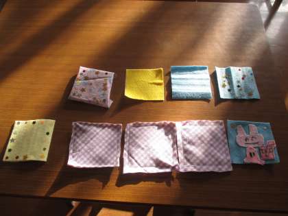 喫茶えのきで使うコースターは手作りコースター。ミシンを使ったり、フェルトにスパンコールをつけたりと思い思いのコースターが出来上がっています。