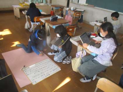 今日は、これまでの福祉体験の学習についての発表会に向けて、準備を始めました。模造紙にまとめるグループとパワーポイントを作成するグループに分かれてそれぞれメンバーで分担しながら進めています。
