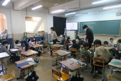 算数科では、分数の計算に入りました。一人学びで考えたことを、上手に友達に伝えたり、全体の場で自分の言葉で伝えたりと、相手に伝わるよう心掛けて説明する姿が輝いています。