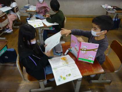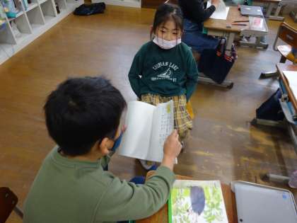 考えたお話のながれを、友だちにせつ明しました。