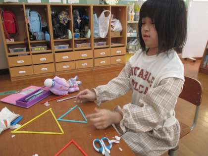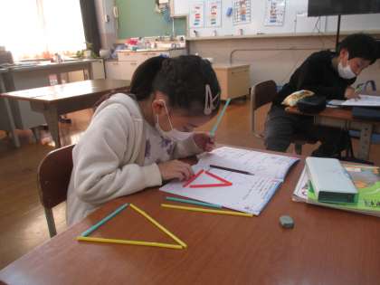 長さの違うストローを使って、二等辺三角形や正三角形をつくりました。自分でつくってみると、形の特徴がよくわかりますね。