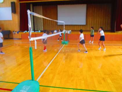 体育では,ソフトバレーボールの単元を始めました。今日はまず初めに必要最低限のルールのみを確認して,ゲームを行いました。まだまだ形になっていないのが現状ですが,これからチームごとにフォーメーションや作戦を考えながら形作っていってほしいと思います。