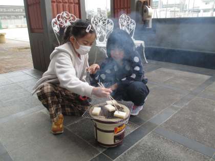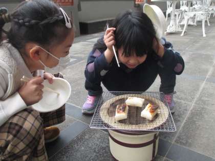 昔の道具について学習しました。洗濯機は昔は洗濯板で。そしてコンロの昔はかまどや七輪。先日、実際に七輪を使ってお餅を焼く体験をしました。火をつけるのは大変でしたが、とてもおいしく焼けました。