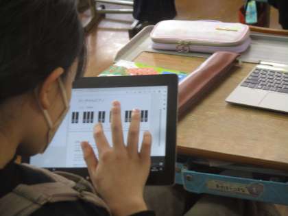 今日は,久しぶりに教室で音楽の学習を行いました。7音の組み合わせで2小節分の旋律を作るという活動です。作る際には,バーチャルピアノを使用して音を確かめながら作っていました。次回ペアでお互いのせんりつを組み合わせて4小節を作る予定をしています。お互いのつくったせんりつのよさや組み合わせを考えて作っていきたいと思います。